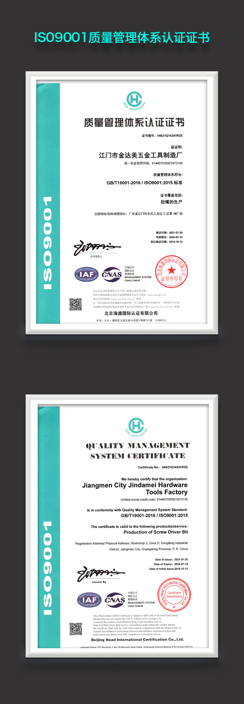 质量管理体系认证证书